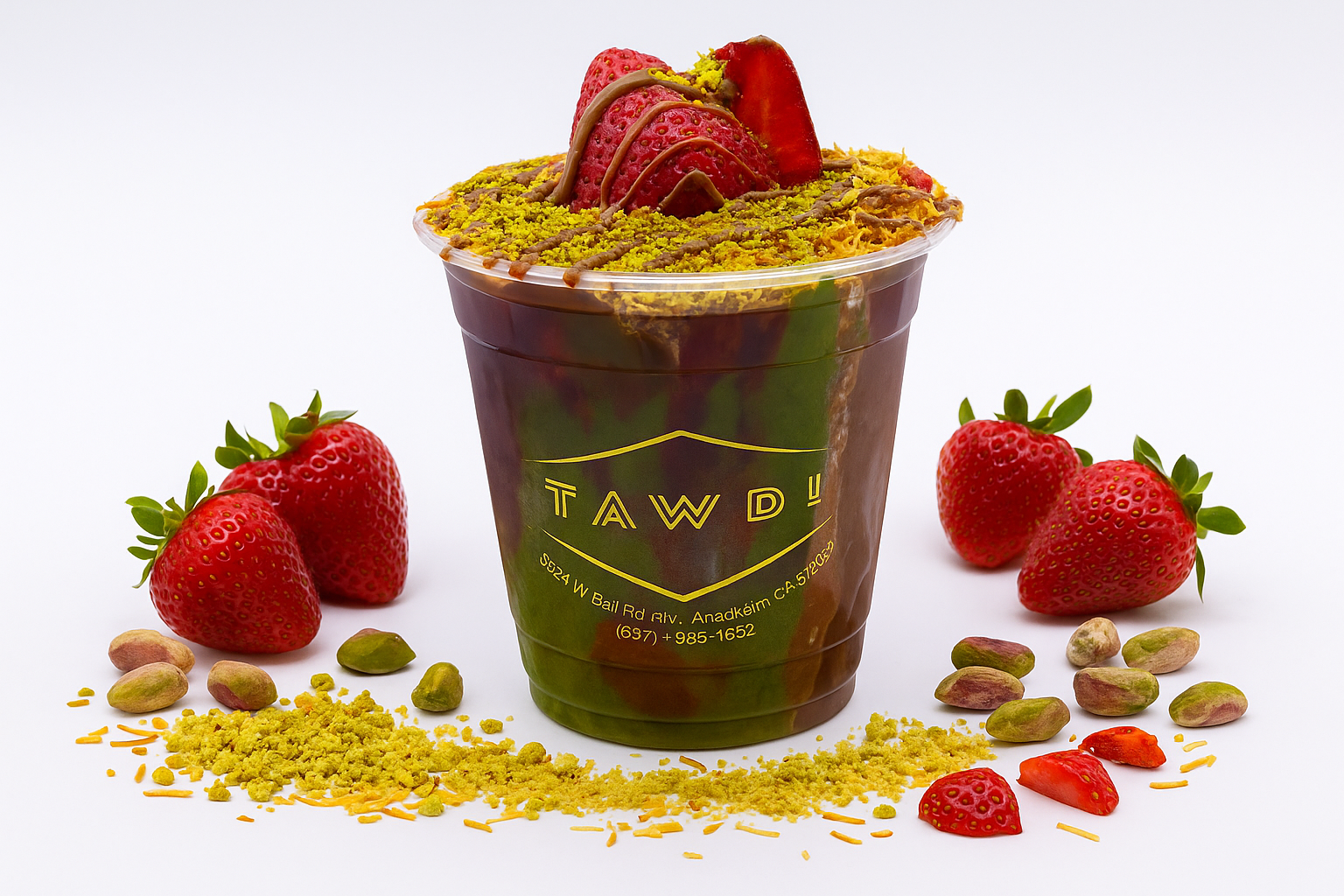Order CupsLayers of melted chocolate, pistachio cream, kunafeh, and fresh strawberry.
